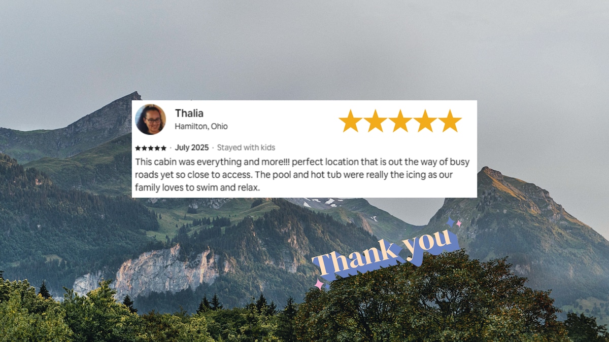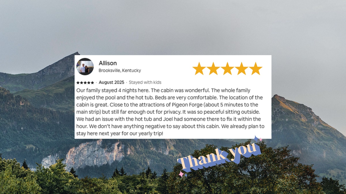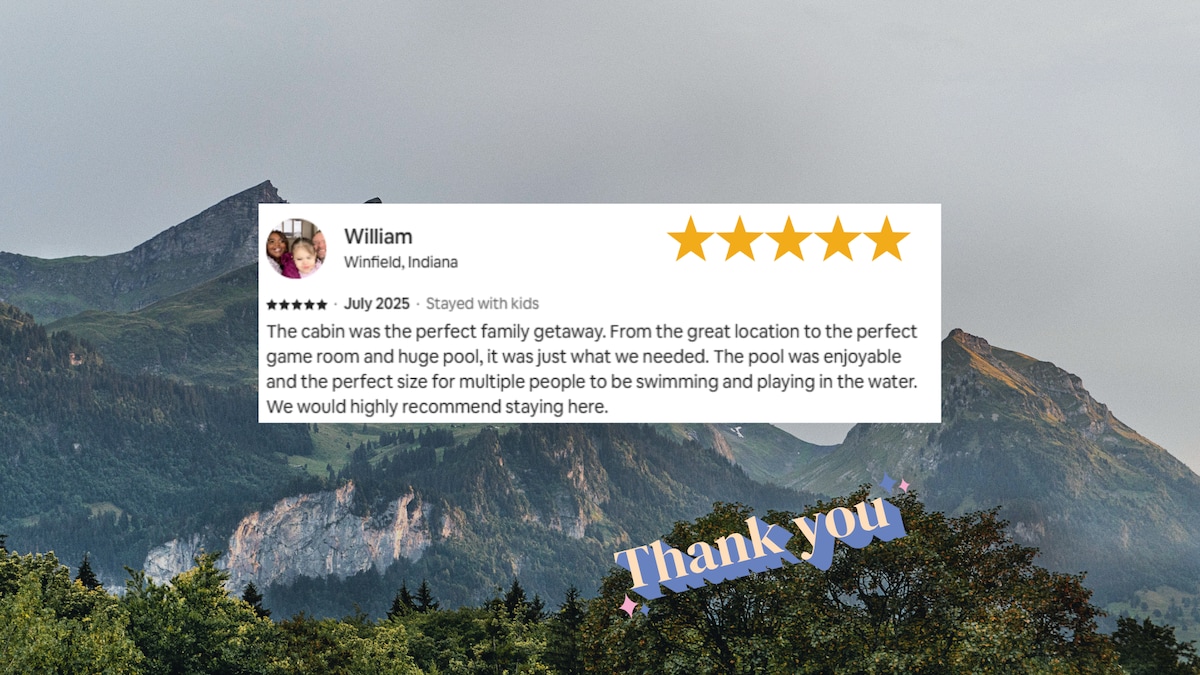 "Outstanding cabin! Great location as it can be accessed via backroads to avoid lots of traffic, but only a 6 minute drive from the heart of pigeon forge. Very spacious rooms and comfortable beds. Pool is absolutely amazing! Everything in perfect working order and well stocked for kitchen needs. Hosts have great communication and very prompt. Would highly recommend!!!”- Jason