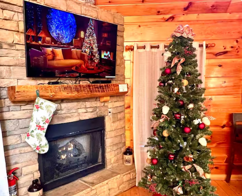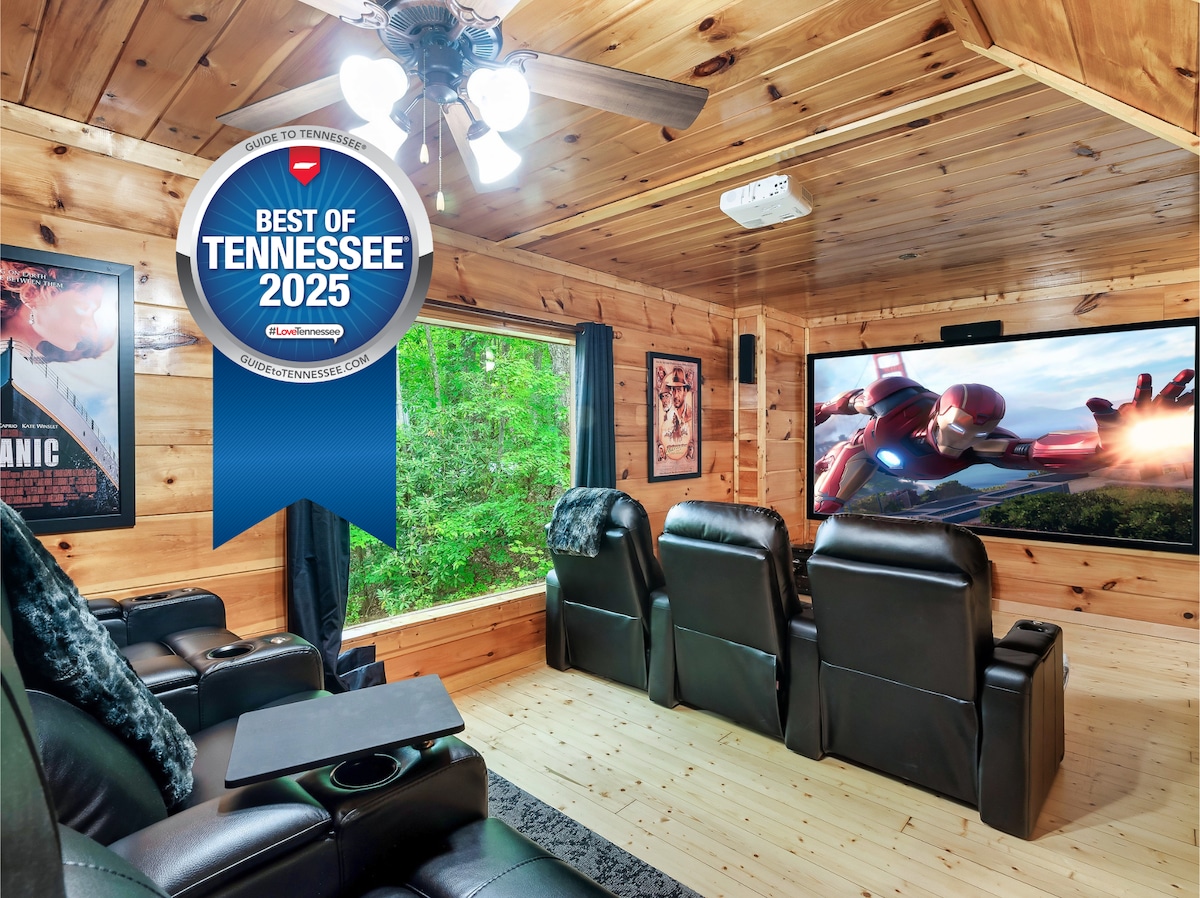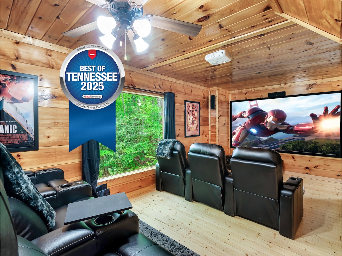 This pet-friendly cabin boasts a prime location and a brand-new theater with stadium-style seating. The 3-level retreat sleeps 7 (2 king beds + twin/queen bunk in game room), perfect for a romantic escape or family fun. Kids will love the 120" screen, arcades and air hockey. Soak in the hot tub and unwind. Roads are steep and winding—AWD required in winter
