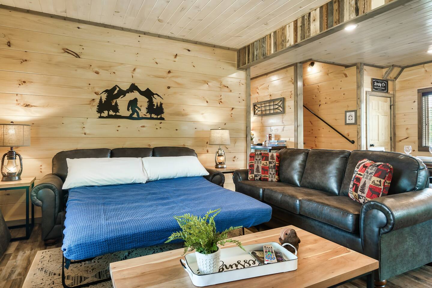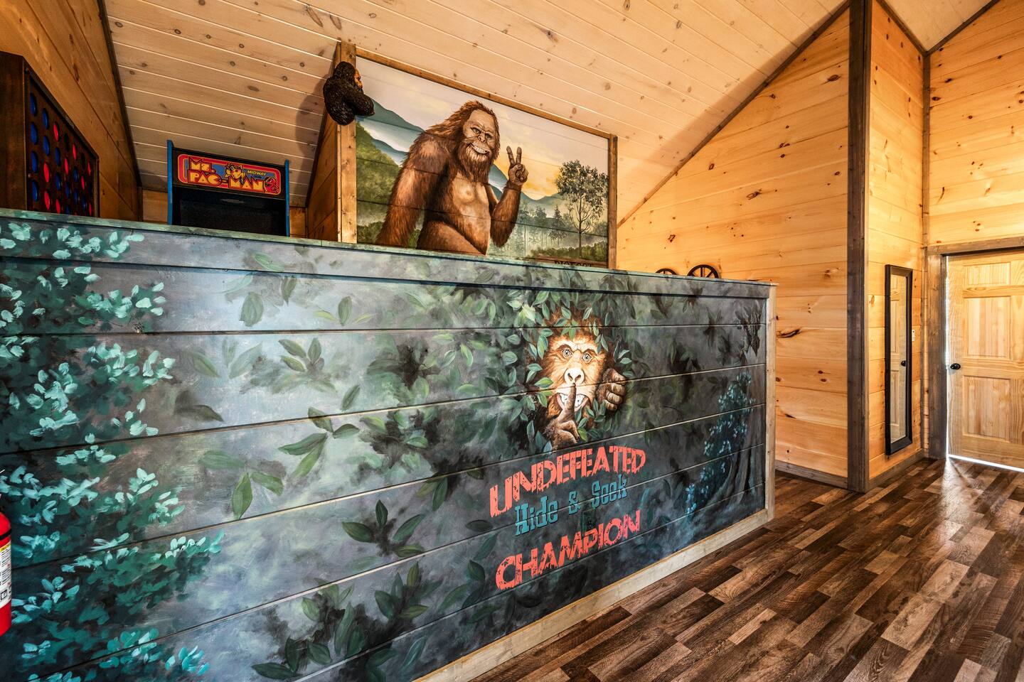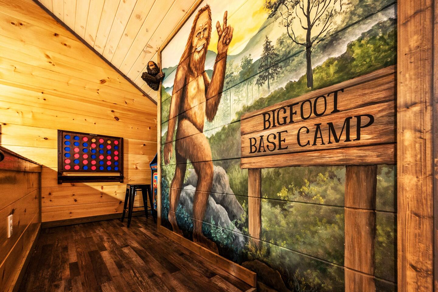Bigfoot Base Camp by Red Glider Getaways Escape to a Bigfoot-themed mountain retreat full of surprises! Thoughtfully designed with 2 eye-catching murals, playful Bigfoot tracks, fun decor, and unique touches throughout. Enjoy a STADIUM theater, large Fire Pit, Hot Tub with OUTDOOR TV, views, 2 ARCADE games, fast WIFI, and a fully stocked kitchen. Ideal for groups (4 bedrooms, each with a private bath). 9 miles to Dollywood 10 Miles to Pigeon Forge đ Best of Tennessee 2025 Award WINNERđ