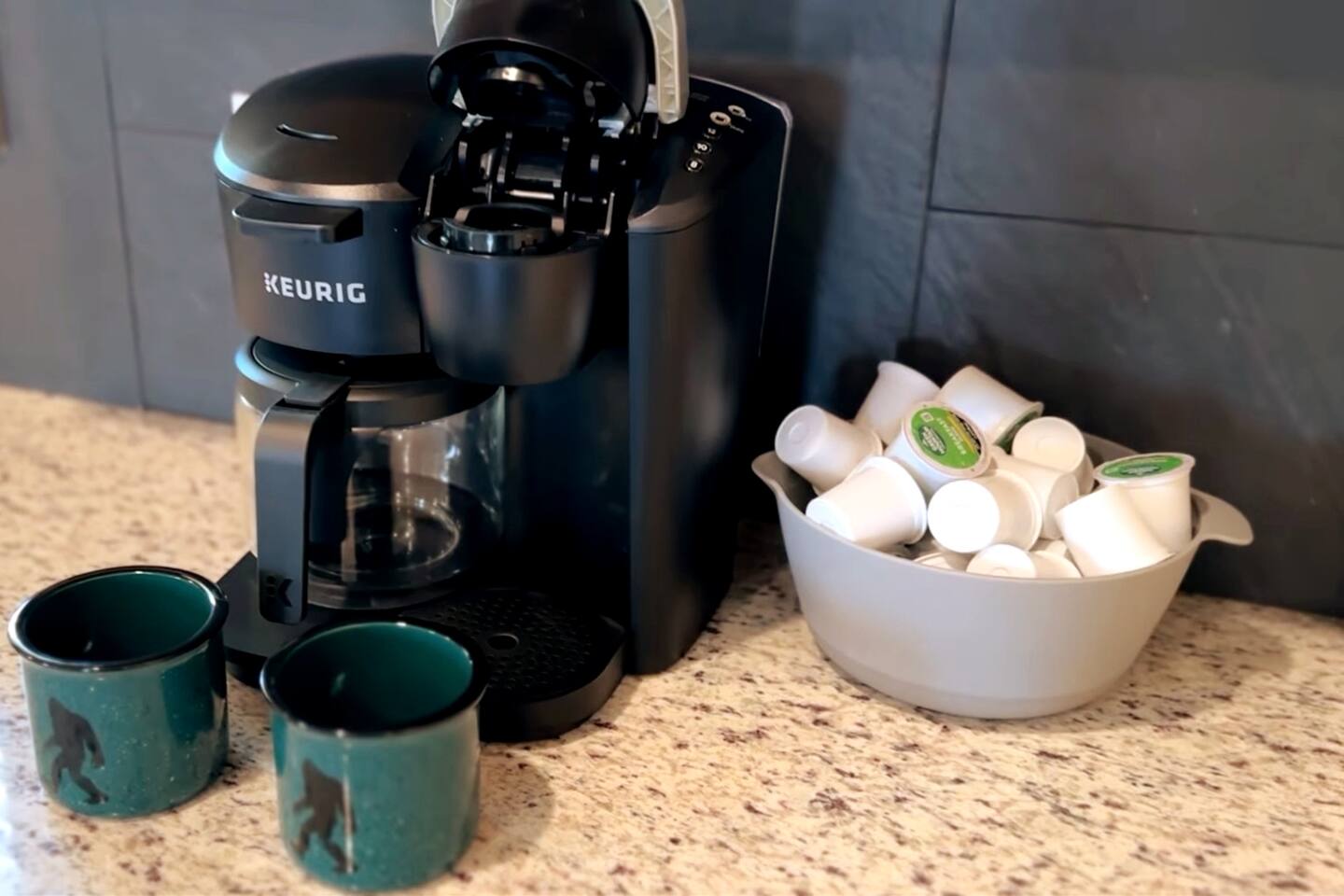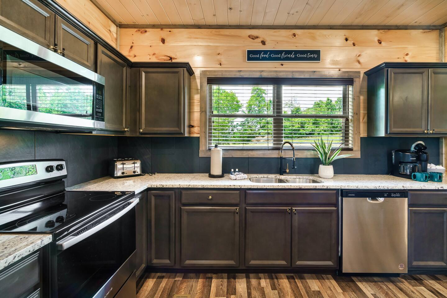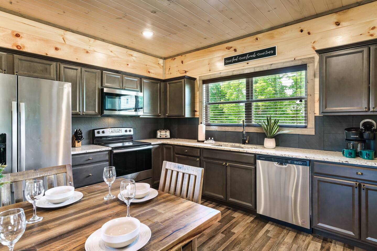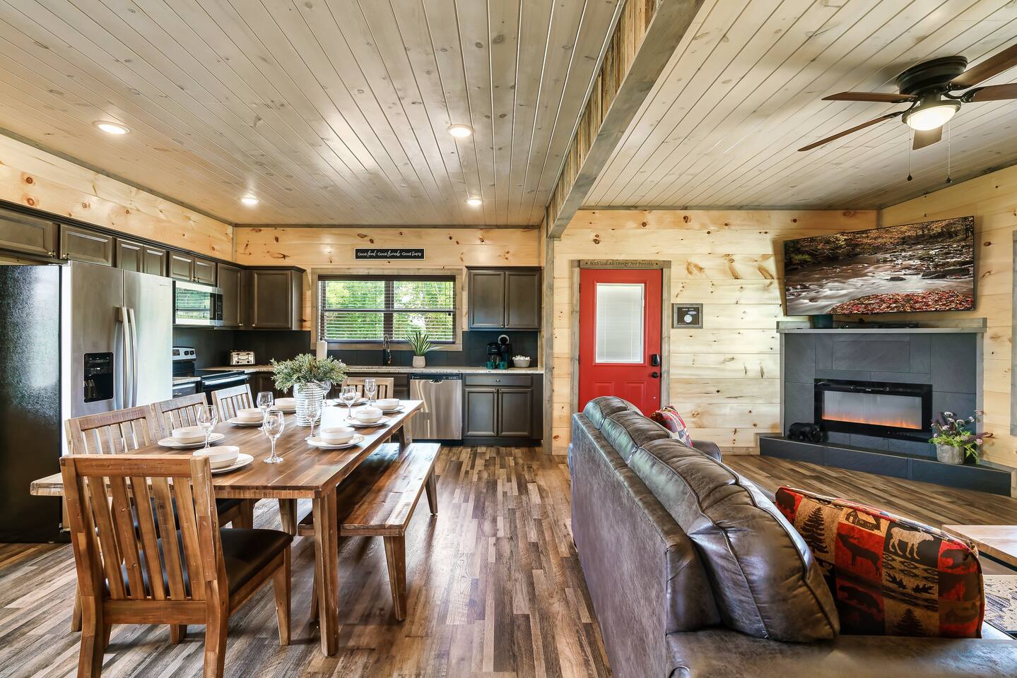 The kitchen is stocked is everything you may need. This includes coffee makers, crock pot, blender, oven, cook top, microwave, dishwasher, refrigerator, pots/pans, strainer, dishes, glasses, utensils... Be sure to bring your own firewood for the wood burning fire pit. Bigfoot Base Camp by Red Glider Getaways