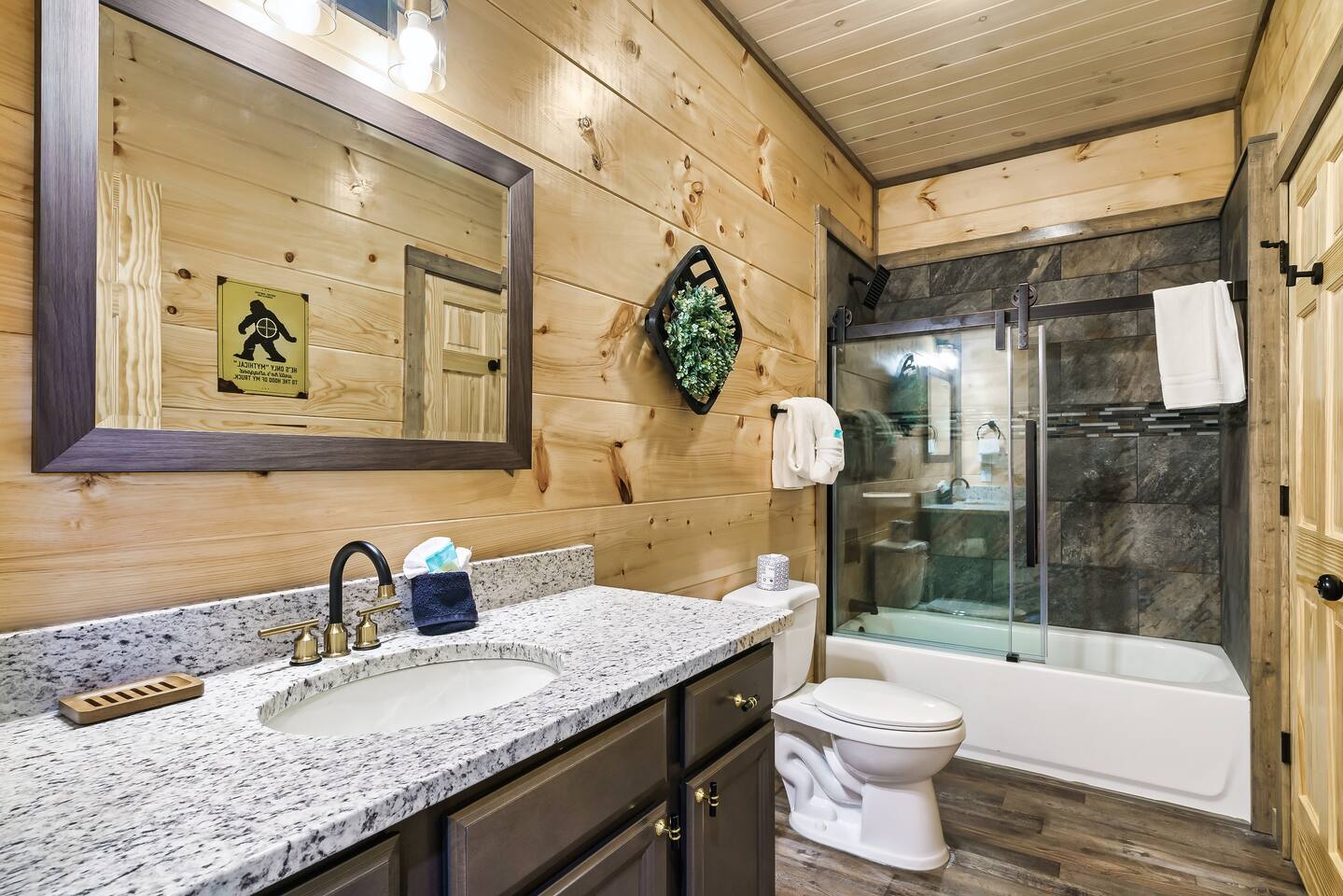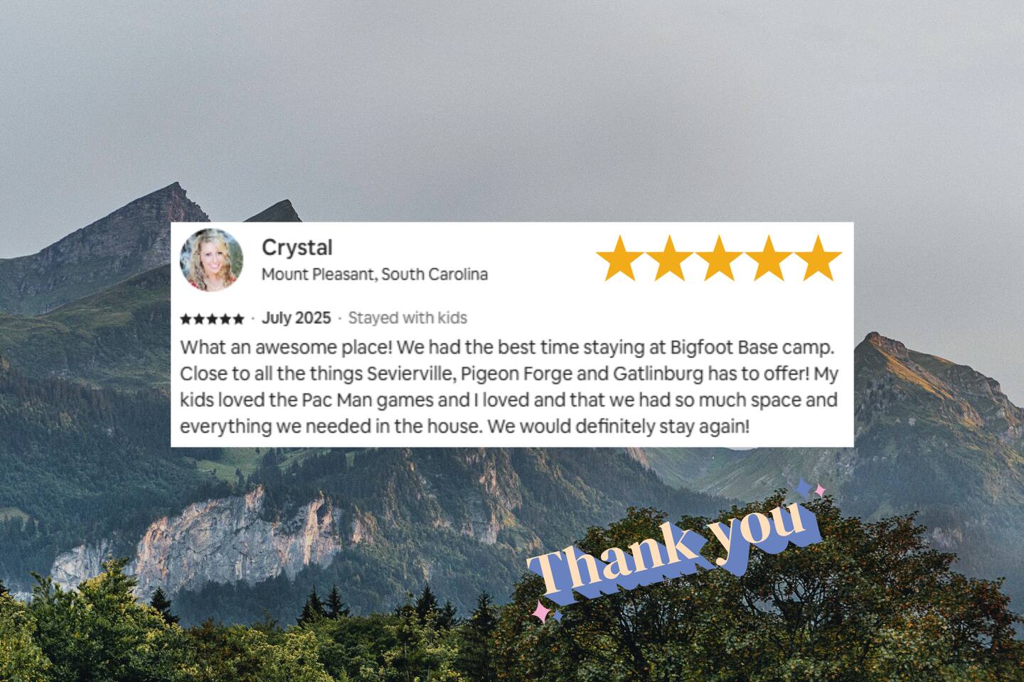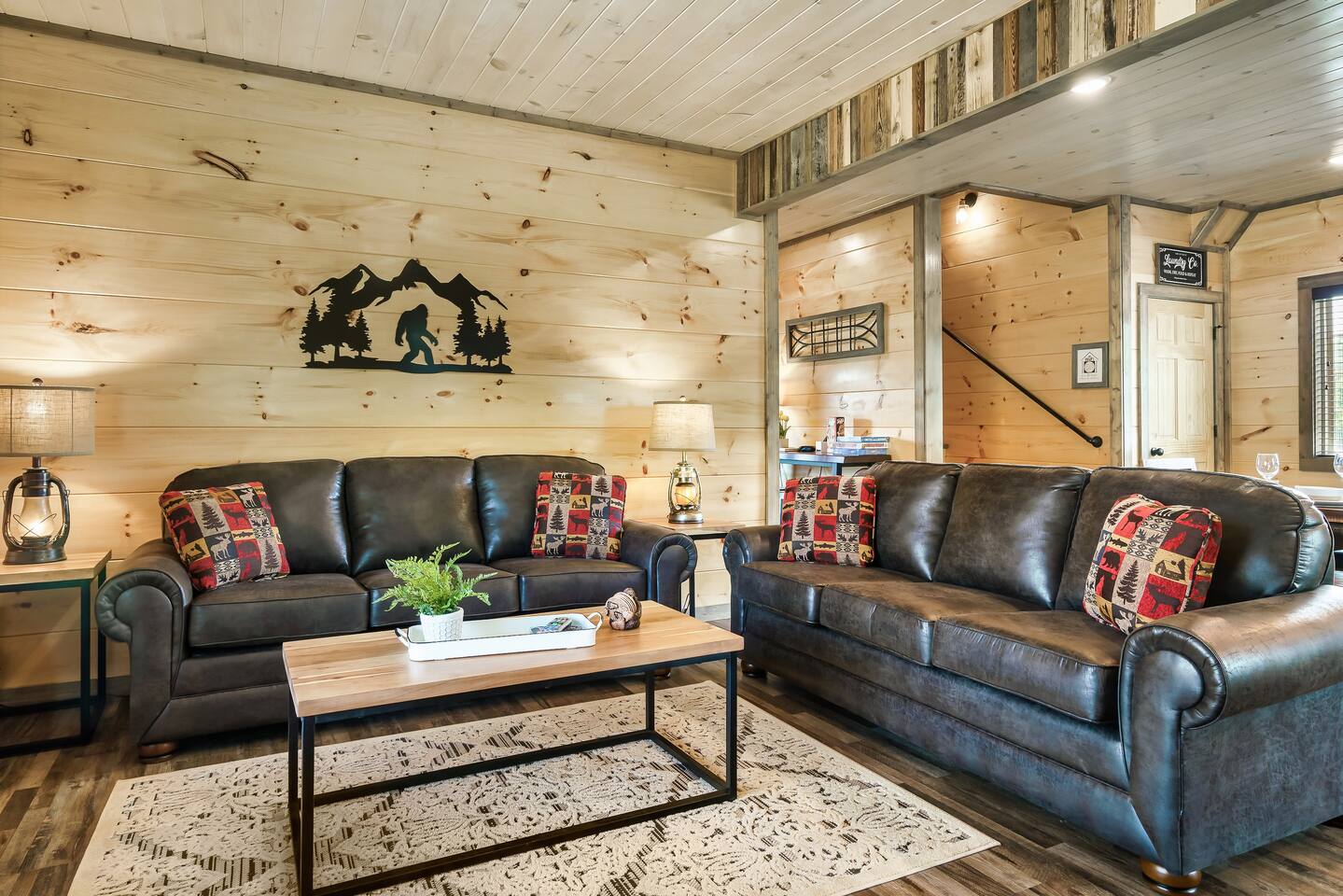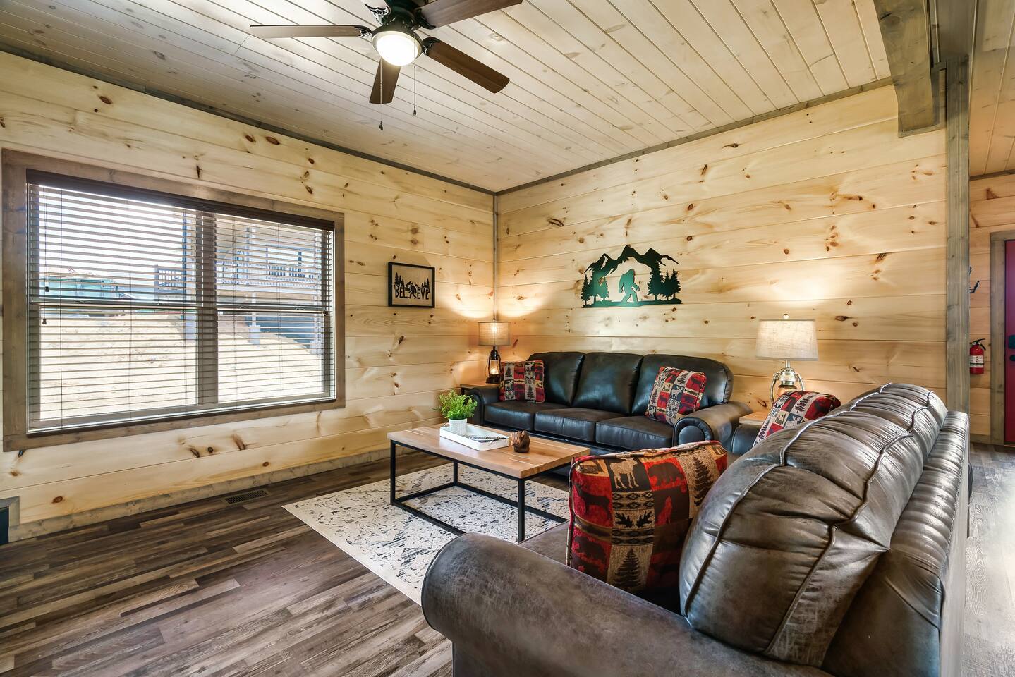 Why should you choose Bigfoot Base Camp? 1. This cabin has an amazing theater with a 65 inch screen, stadium type seating and full surround sound. 2. Do you love Bigfoot? We have tastefully themed this cabin with Bigfoot dĂ©cor, murals, wood carvings, foot steps, 8 foot metal cutouts around the fire pit, coffee mugs, etc. 3. The cabin is BRAND NEW and is furnished with high end furniture, TVs (bring your own streaming logins) and arcades. 4. The views off of the back porch / hot tub make you forget that Pigeon Forge is just a few mins away. There is also a TV on the patio for you to watch while in the hot tub. 5. NO STEEP ROADS!!! 6. We pride ourselves with excellent customer service, resulting in over 75 star reviews from past guests. â High speed WiFi (350+ Mbps) â 2,200 sqr/ft â Brand new Theater (65 inch screen), stadium seating and surround sound! â Great view from the deck â Brand new Hot Tub and outdoor TV â 6 New TVs (65 inch in Living Room and in theater) â Smart TVs in all rooms - Bring your own streaming logins. â 4 Bedrooms (3 King, 1 Queen) - Each BR has a dedicated bathroom. â Washer / Dryer available onsite â Parking for 4 cars â Game area upstairs (huge connect 4, 2 arcade games and board games) â Queen Sofa bed in living room â Charcoal grill â Fully equipped + stocked kitchen Here Are A Few Kind Words From Our Past Guests: "A wonderful place to stay for a quick weekend trip with the family! Loved that all of the roads to the cabin were flat and maintained. Joel was super friendly and fast to respond. He had QR codes all around the house with videos about how to use everything - all houses should have these! The house was SUPER clean and had everything you need. We enjoyed playing on the arcade machines and sitting in the theater to watch a movie. Check in and check out was a breeze. We hope to stay with Joel again for any future trips!" - Kelsey "Bigfoot lodge was amazing! Plenty of space for my family of 10 with many amenities. This place is so well equipped for a long weekend trip or longer and is easy to fun and close to everything. Dollywood was so easy to get to and was perfect with the use of back roads as you were able to skip all the traffic. Joel and his team are so responsive and proactive in offering suggestions for everything! We will be looking to stay here again in the near future! Thanks again!" - Blaine "My stay at Joelâs place was amazing!! I loved everything about their home. Everything was organized and not too far from things to do. Highly recommended!" - Aushai More about the cabin: As you enter, you'll be greeted by the sight of Bigfoot's footprints leading you towards adventure. Follow these tracks, and they will guide you to our inviting fire pit, where you can gather with your friends and family to share stories and roast marshmallows under the starry night sky. The crackling fire provides the perfect backdrop for sharing your own Bigfoot encounters or discussing the mysteries of the forest. But the excitement doesn't stop there. Bigfoot Base Camp offers a plethora of amenities designed to make your stay unforgettable. Step into our state-of-the-art theater room and indulge in a cinematic experience like no other. Sink into plush seating and enjoy your favorite movies or binge-watch your beloved TV shows on a large screen. The immersive sound system will transport you deep into the heart of the wilderness, enhancing your Bigfoot adventure. After a long day of exploration, soothe your muscles and relax in the luxurious hot tub. Immerse yourself in the warm, bubbling water while enjoying the company of friends or family. And to top it off, we've even installed an outdoor TV, so you can catch up on your favorite shows or watch sporting events while indulging in the ultimate relaxation. Bigfoot Base Camp offers breathtaking views of the surrounding natural beauty. Whether you're lounging on the deck or gazing through the large windows, you'll be treated to stunning vistas that showcase the majesty of the Smoky Mountains. Watch as the sunlight dances on the tree canopy or marvel at the vibrant colors of the changing seasons. If you're in the mood for some friendly competition, head to our arcade area where you'll find a variety of games to keep you entertained for hours. Challenge your companions to a round of classic arcade games or try your hand at the latest virtual adventures. There's never a dull moment at Bigfoot Base Camp! Hungry? Our fully stocked kitchen has everything you need to prepare delicious meals for your group. From modern appliances to ample counter space, you'll find all the tools necessary to whip up culinary delights. Share laughter and good times around the spacious dining table as you savor your creations and create lasting memories. Bigfoot Base Camp is thoughtfully designed to accommodate large groups with ease. Each of the four bedrooms is equipped with its own bathroom, ensuring privacy and convenience for all guests. No more waiting in line for the shower or arguing over who gets the ensuite. At Bigfoot Base Camp, everyone can enjoy their own space and relax in comfort. While you'll feel worlds away at Bigfoot Base Camp, it's worth noting that adventure and attractions are just a short distance away. We're conveniently located just 9 miles from the thrill of Dollywood, where you can experience exciting rides, live entertainment, and immerse yourself in the culture of the Smoky Mountains. If shopping is your passion, the Tanger Outlet Mall is also a mere 9 miles away, offering a wide range of stores to satisfy your retail desires. And for those seeking the bustling energy of Gatlinburg, it's a scenic 18-mile drive that will transport you to this vibrant mountain town. At Bigfoot Base Camp by Red Glider Getaways, we invite you to embark on an unforgettable adventure where the legends of Bigfoot come to life. Unleash your inner explorer, create memories that will last a lifetime, and discover the magic of th