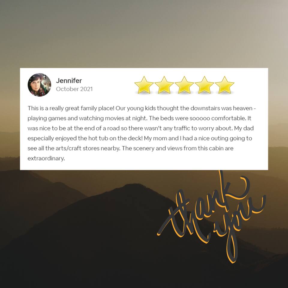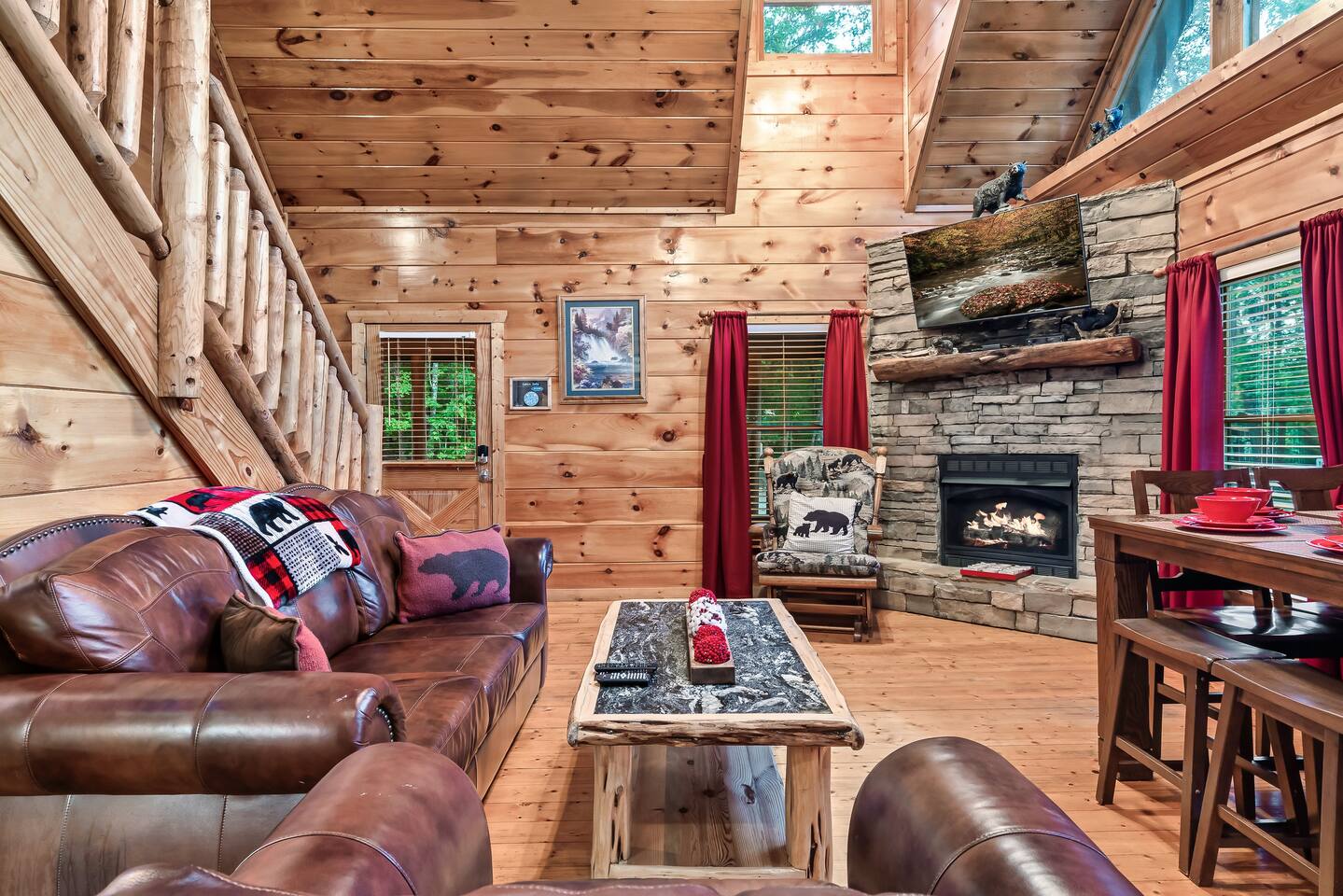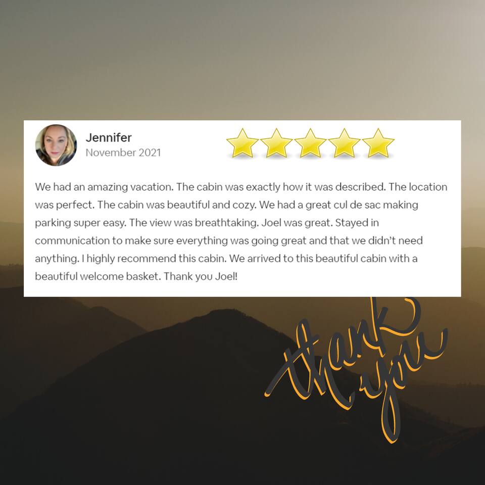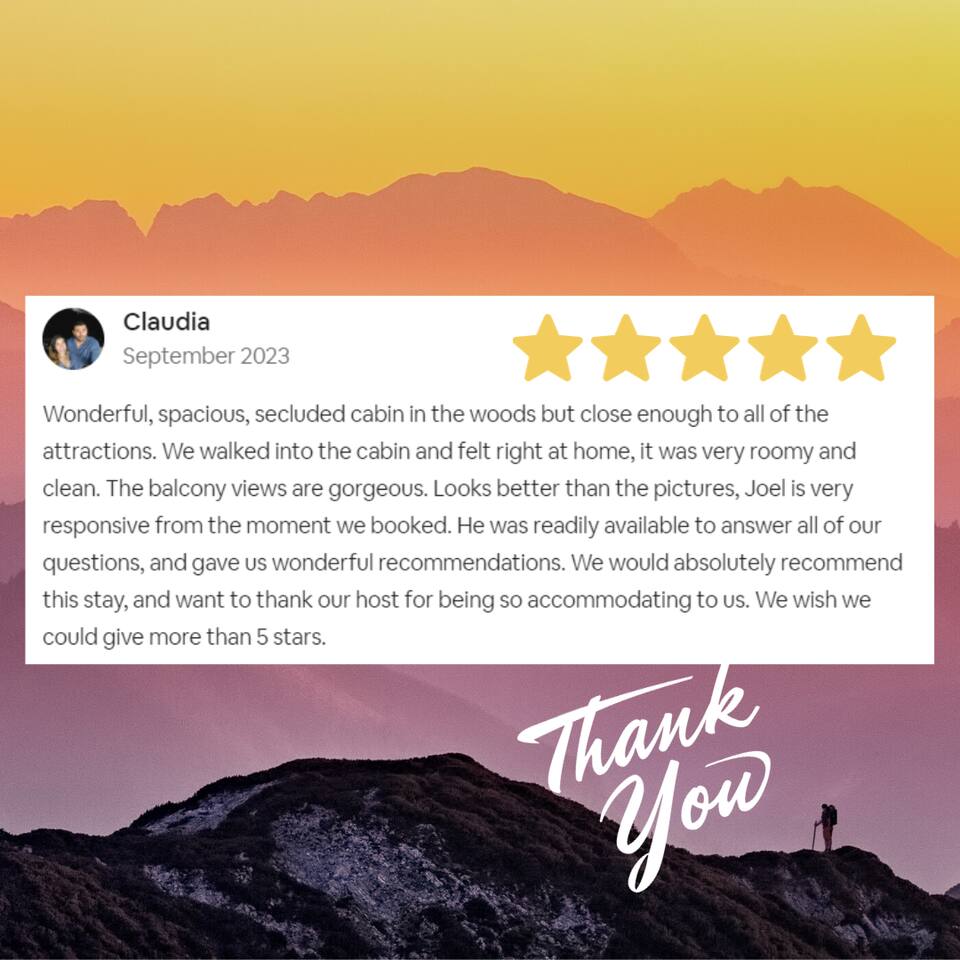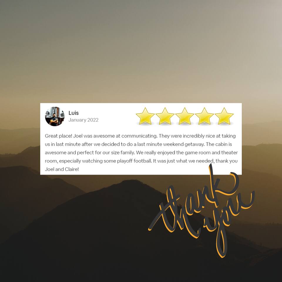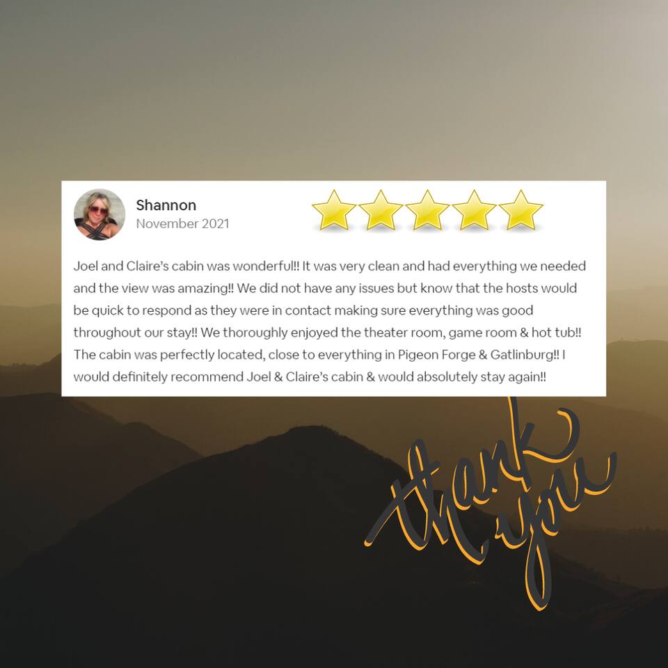 Why should you choose Beary High ? 1. This cabin has an amazing theater with a HUGE 10 foot projection screen and NEW leather recliners. 2. The 2 level deck is covered and has an amazing VIEW. Eat dinner at the covered picnic table and take it in. 3. The kitchen has recently been remodeled. (New countertops, new sink, painted cabinets, etc.) 4. We pride ourselves with excellent customer service, resulting in over 235 5 star reviews from past guests. 5. Located right in between Pigeon Forge and Gatlinburg, very close to both. Dollywood is minutes away. High speed WIFI! (200MBs) â 2,300 square feet â 4 flat screen TVs and a 120" screen in media room, All 5 with Roku or Chromecast - Bring your own streaming logins. â Brand NEW theater with Cable and Chromecast (for streaming all of your apps) â Excellent WIFI throughout. â Kitchen is fully stocked and recently remodeled. â Media room (with 6 leather recliners) â Game room (with NEW pool table and arcade) â Gas fireplace in Living room. â The cabin is semi-private. You can see other cabins from the front porch, but the trees do give you a good amount of privacy and it is a quiet area. The cabin is located on a cul-de-sac and there is room to park 3 cars. â Patio lights have been installed on both levels of the porch â Cabin decorated for Christmas Welcome to Beary High by Red Glider Getaways, your perfect getaway in the majestic Smoky Mountains! Our charming cabin is nestled amidst the mountains, offering breathtaking views and a range of entertainment options. With three levels, this spacious retreat comfortably accommodates up to 8 guests in cozy beds, making it an ideal choice for both romantic escapes and memorable family vacations. There is 1 King bedroom on the main level, 1 King bed in the lofted bedroom and a Queen over Queen bunk bed in the game room on the lowest level. The kids will be delighted with the movie room featuring a massive 120" screen, as well as the arcade and pool table, ensuring endless hours of fun. And for ultimate relaxation, don't miss the soothing hot tub, where you can unwind while taking in the serene surroundings. Stay connected with our high-speed Wi-Fi, boasting a blazing 200MBs for all your browsing needs. The cabin spans over 2,300 square feet and offers modern comforts such as four flat-screen TVs and an impressive 120" screen in the media room, all equipped with Roku for your entertainment pleasure (bring your own streaming logins). You'll enjoy excellent Wi-Fi coverage throughout the cabin, ensuring seamless connectivity. The fully stocked kitchen invites you to prepare delicious meals, while the media room, complete with six plush leather recliners, provides the perfect spot to indulge in your favorite movies or TV shows. The game room features a pool table and arcade games, ensuring everyone in your party has a fantastic time. Warm up by the cozy gas fireplace in the living room during cooler months, creating a cozy ambiance. Beary High offers a semi-private setting, allowing you to appreciate the natural beauty of the surroundings. From the front porch, you'll catch glimpses of other cabins, yet the surrounding trees provide ample privacy, creating a tranquil atmosphere. Nestled on a cul-de-sac, the cabin provides parking space for three cars, and the installation of patio lights on both levels of the porch adds a delightful touch to your evenings. If you visit during the Christmas season, you'll be enchanted by the festive decorations that adorn the cabin. Please note that the fireplace is operational from October through March, offering warmth and coziness during the colder months. It's important to be aware that the roads leading to the cabin are winding and steep, so during the winter season, we recommend an all-wheel drive (AWD) vehicle for your safety and convenience. Choose Beary High for an unforgettable Smoky Mountains experience, where you can create lasting memories, relax in comfort, and immerse yourself in the beauty of nature. Here Are A Few Kind Words From Our Past Guests: "My husband and I stayed at Joelâs cabin for a three day weekend trip and couldnât be more pleased with the experience! Joel was an amazing host and the cabin was stunningâŚnot to mention the view was fabulous! Iâve rented several Airbnb houses in a few states now and this one was my favorite. I absolutely will be renting it again:)" - Lea "Beary High is a wonderful cabin to stay. I went with my wife and son and had a blast. They view is amazing and the cabin has everything you need for a comfortable and fun stay. The home theater downstairs was great to watch movies and relax after a long day of site seeing and running around. Overall, wonderful stay and will consider staying again the future." - Daniel "Great cabin and host. This is what you imagine a Smokey Mountain vacation cabin should be. Theater room, hot tub, and arcade room great for relaxing nights or rainy days. We had no issues and Joel is a wonderful host who communicates to make sure you are happy. The view from the porch swing while drinking morning coffee is beautiful." - Charles "Joel is an amazing host, communication was well above and beyond what I'm used to on Airbnb. The location and amenities are exactly as described and the cabin is beautiful (I was extra partial to the swing on the deck, hot tub, and theater room lol), and the location is perfect for anyone looking to enjoy the national park and Pigeon Forge/Gatlinburg area . We will definitely look here first when we plan our next trip to the smokies! Thanks again!" - Jason