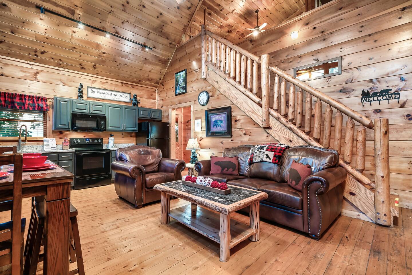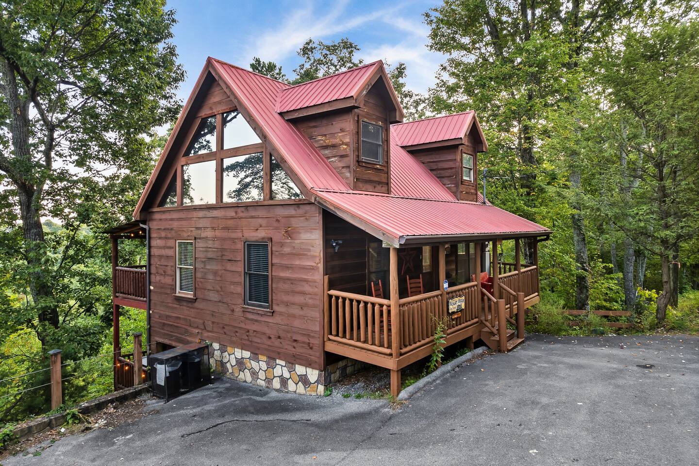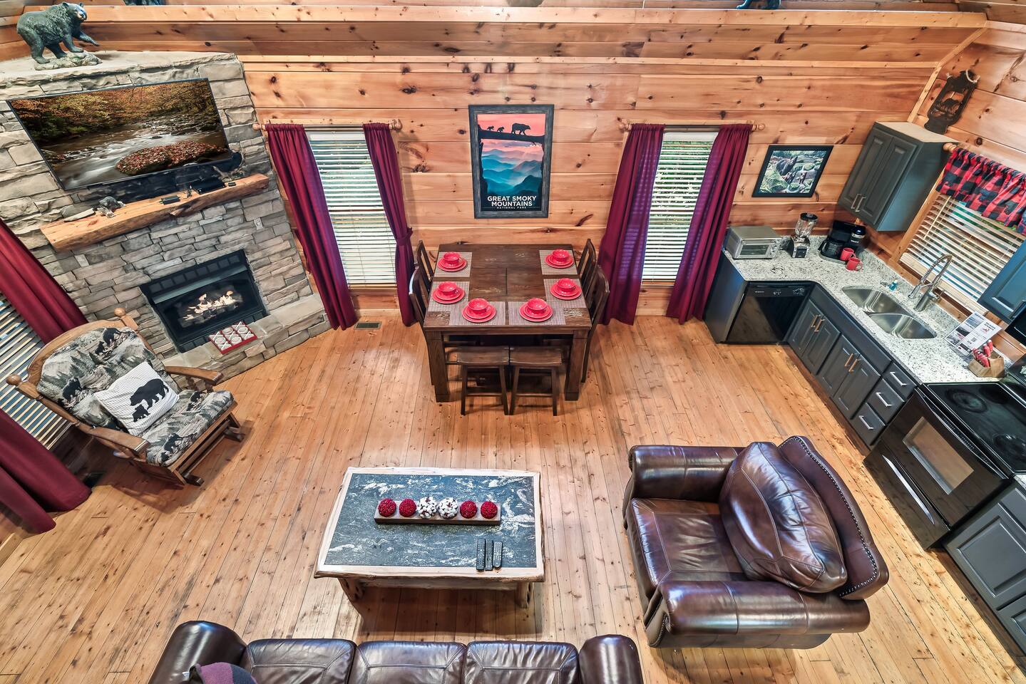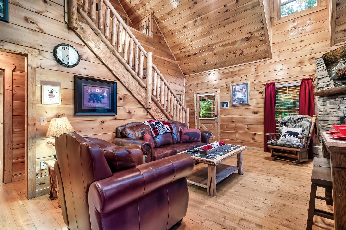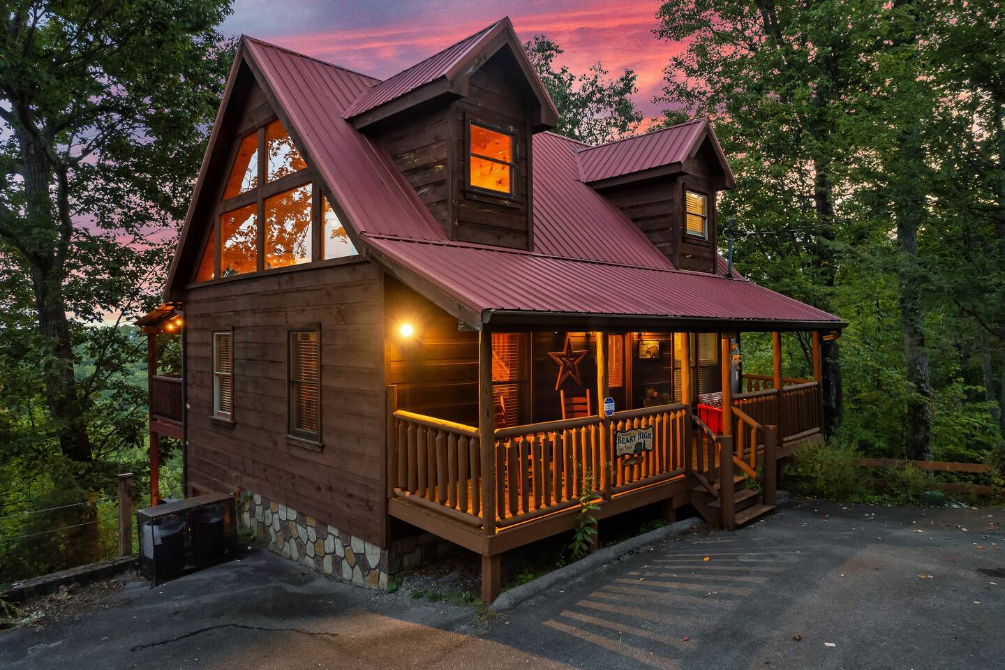 Why should you choose Beary High ? 1. This cabin has an amazing theater with a HUGE 10 foot projection screen and NEW leather recliners. 2. The 2 level deck is covered and has an amazing VIEW. Eat dinner at the covered picnic table and take it in. 3. The kitchen has recently been remodeled. (New countertops, new sink, painted cabinets, etc.) 4. We pride ourselves with excellent customer service, resulting in over 235 5 star reviews from past guests. 5. Located right in between Pigeon Forge and Gatlinburg, very close to both. Dollywood is minutes away. High speed WIFI! (200MBs) â 2,300 square feet â 4 flat screen TVs and a 120" screen in media room, All 5 with Roku or Chromecast - Bring your own streaming logins. â Brand NEW theater with Cable and Chromecast (for streaming all of your apps) â Excellent WIFI throughout. â Kitchen is fully stocked and recently remodeled. â Media room (with 6 leather recliners) â Game room (with NEW pool table and arcade) â Gas fireplace in Living room. â The cabin is semi-private. You can see other cabins from the front porch, but the trees do give you a good amount of privacy and it is a quiet area. The cabin is located on a cul-de-sac and there is room to park 3 cars. â Patio lights have been installed on both levels of the porch â Cabin decorated for Christmas Welcome to Beary High by Red Glider Getaways, your perfect getaway in the majestic Smoky Mountains! Our charming cabin is nestled amidst the mountains, offering breathtaking views and a range of entertainment options. With three levels, this spacious retreat comfortably accommodates up to 8 guests in cozy beds, making it an ideal choice for both romantic escapes and memorable family vacations. There is 1 King bedroom on the main level, 1 King bed in the lofted bedroom and a Queen over Queen bunk bed in the game room on the lowest level. The kids will be delighted with the movie room featuring a massive 120" screen, as well as the arcade and pool table, ensuring endless hours of fun. And for ultimate relaxation, don't miss the soothing hot tub, where you can unwind while taking in the serene surroundings. Stay connected with our high-speed Wi-Fi, boasting a blazing 200MBs for all your browsing needs. The cabin spans over 2,300 square feet and offers modern comforts such as four flat-screen TVs and an impressive 120" screen in the media room, all equipped with Roku for your entertainment pleasure (bring your own streaming logins). You'll enjoy excellent Wi-Fi coverage throughout the cabin, ensuring seamless connectivity. The fully stocked kitchen invites you to prepare delicious meals, while the media room, complete with six plush leather recliners, provides the perfect spot to indulge in your favorite movies or TV shows. The game room features a pool table and arcade games, ensuring everyone in your party has a fantastic time. Warm up by the cozy gas fireplace in the living room during cooler months, creating a cozy ambiance. Beary High offers a semi-private setting, allowing you to appreciate the natural beauty of the surroundings. From the front porch, you'll catch glimpses of other cabins, yet the surrounding trees provide ample privacy, creating a tranquil atmosphere. Nestled on a cul-de-sac, the cabin provides parking space for three cars, and the installation of patio lights on both levels of the porch adds a delightful touch to your evenings. If you visit during the Christmas season, you'll be enchanted by the festive decorations that adorn the cabin. Please note that the fireplace is operational from October through March, offering warmth and coziness during the colder months. It's important to be aware that the roads leading to the cabin are winding and steep, so during the winter season, we recommend an all-wheel drive (AWD) vehicle for your safety and convenience. Choose Beary High for an unforgettable Smoky Mountains experience, where you can create lasting memories, relax in comfort, and immerse yourself in the beauty of nature. Here Are A Few Kind Words From Our Past Guests: "My husband and I stayed at Joelâs cabin for a three day weekend trip and couldnât be more pleased with the experience! Joel was an amazing host and the cabin was stunningâŚnot to mention the view was fabulous! Iâve rented several Airbnb houses in a few states now and this one was my favorite. I absolutely will be renting it again:)" - Lea "Beary High is a wonderful cabin to stay. I went with my wife and son and had a blast. They view is amazing and the cabin has everything you need for a comfortable and fun stay. The home theater downstairs was great to watch movies and relax after a long day of site seeing and running around. Overall, wonderful stay and will consider staying again the future." - Daniel "Great cabin and host. This is what you imagine a Smokey Mountain vacation cabin should be. Theater room, hot tub, and arcade room great for relaxing nights or rainy days. We had no issues and Joel is a wonderful host who communicates to make sure you are happy. The view from the porch swing while drinking morning coffee is beautiful." - Charles "Joel is an amazing host, communication was well above and beyond what I'm used to on Airbnb. The location and amenities are exactly as described and the cabin is beautiful (I was extra partial to the swing on the deck, hot tub, and theater room lol), and the location is perfect for anyone looking to enjoy the national park and Pigeon Forge/Gatlinburg area . We will definitely look here first when we plan our next trip to the smokies! Thanks again!" - Jason